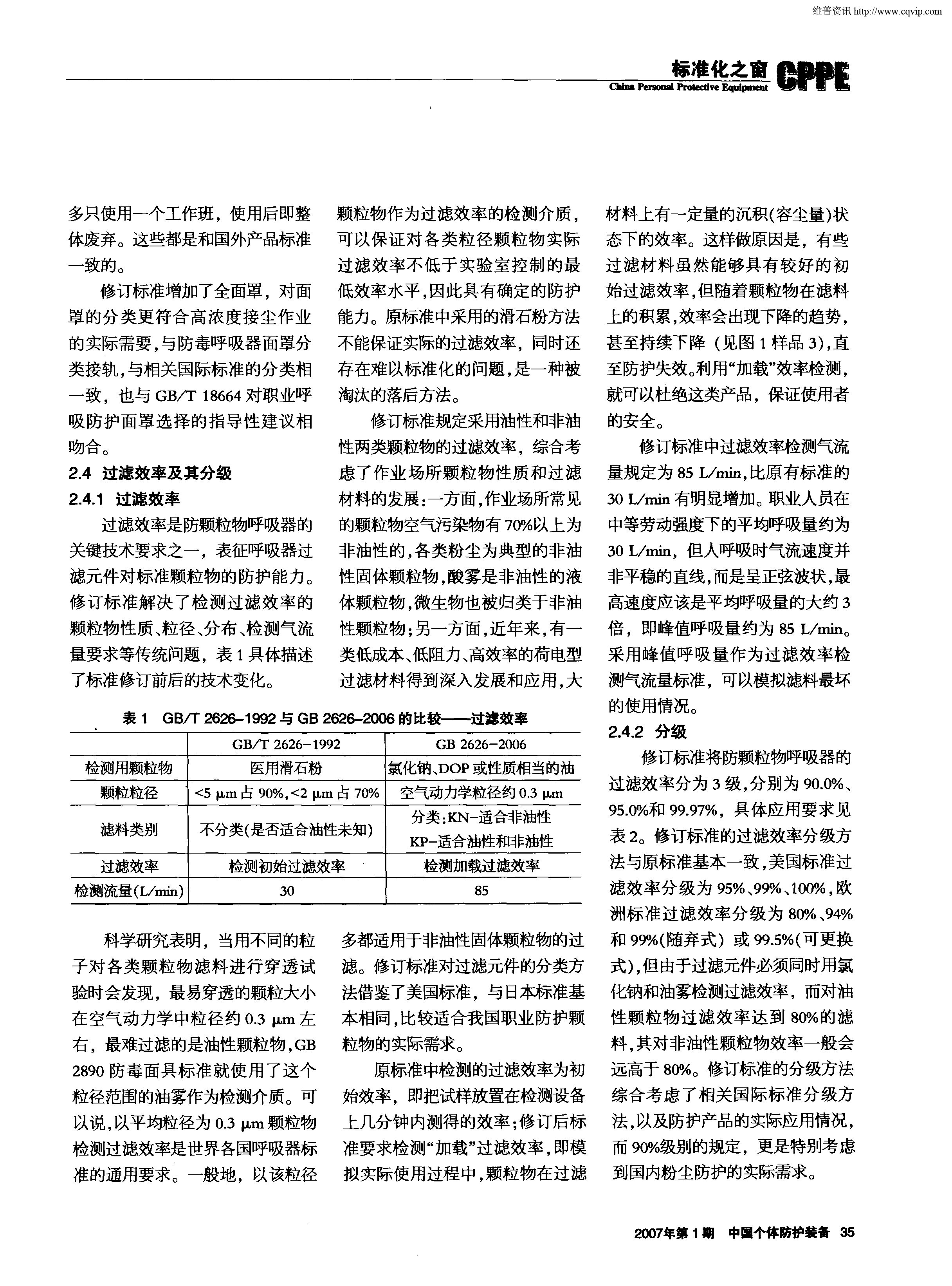 表1GB/T2626-1992與GB2626-2006的比較—過(guò)濾效率