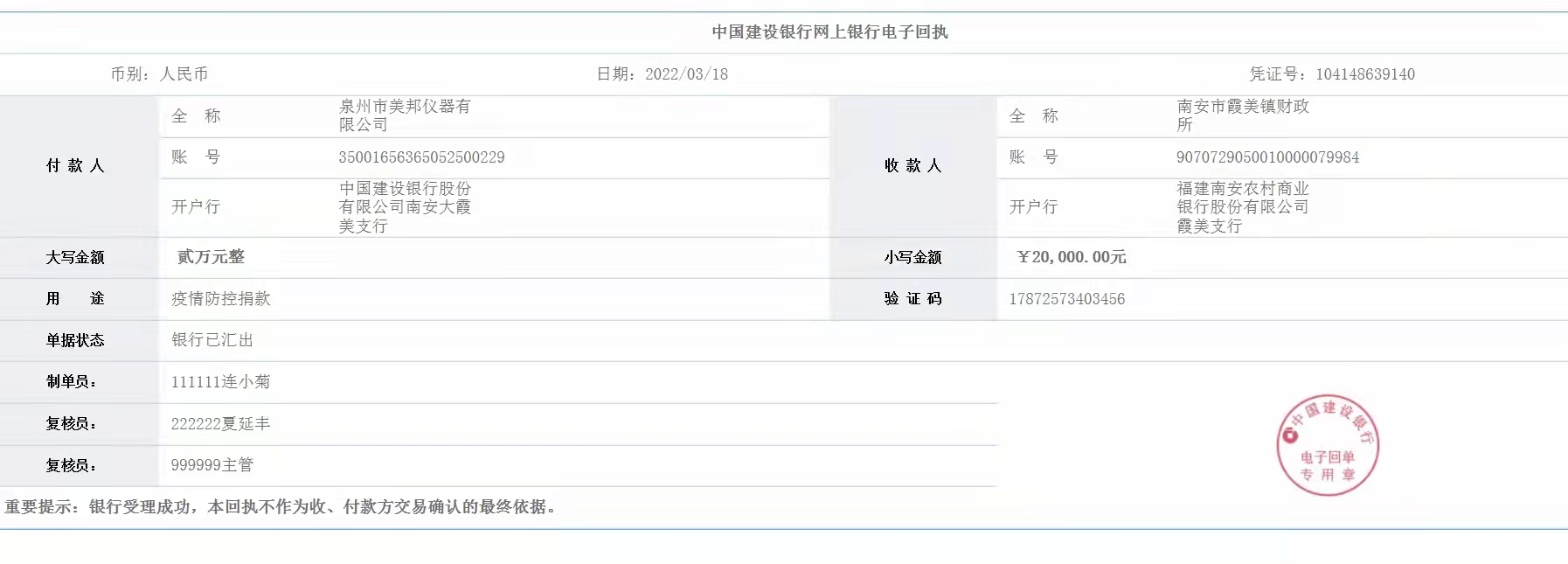 2022年3月18日,美邦儀器向泉州南安市霞美鎮(zhèn)人民政府支援捐款2萬元,助力泉州南安市霞美鎮(zhèn)疫情防控工作,為疫情防控盡一份綿薄之力!