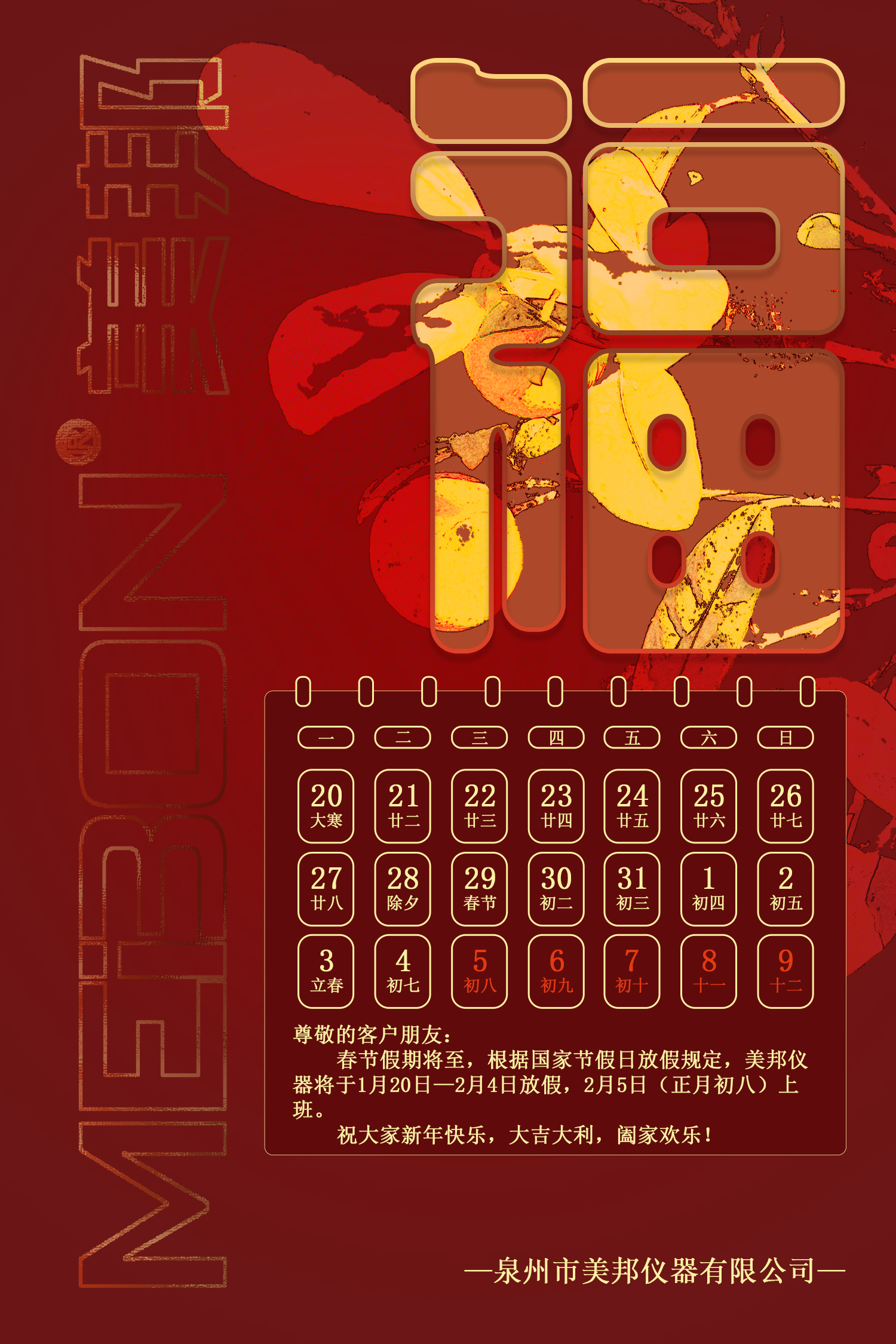 春節(jié)假期將至,根據(jù)國家節(jié)假日放假規(guī)定,美邦儀器將于1月20日—2月4日放假,2月5日(正月初八)上班。